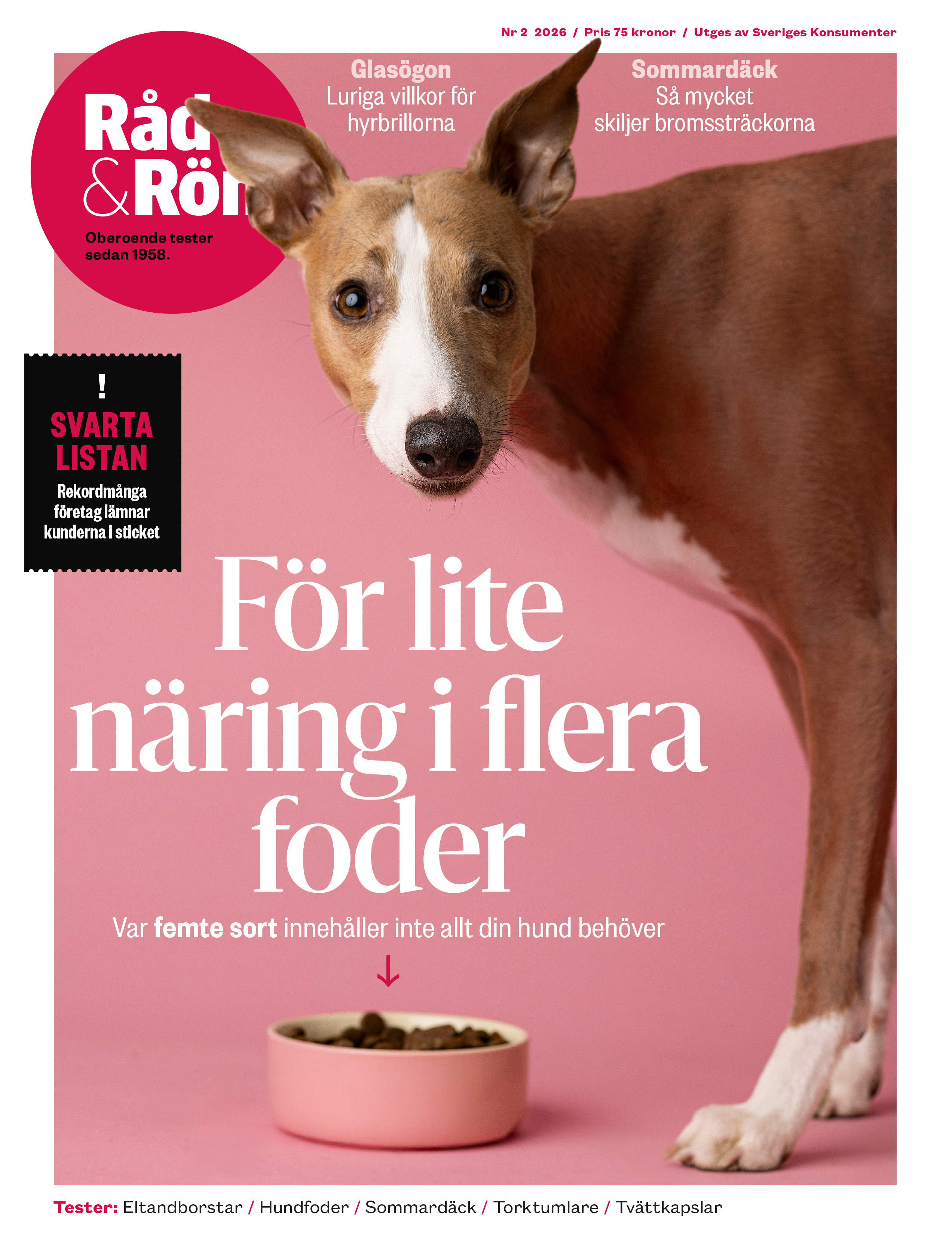 Innehåll i tidningen Nr 2/2026 Innehåller tester och granskningar av: Eltandborstar Hundfoder Sommardäck Torktumlare Tvättkapslar Klicka här för att ladda ner högupplöst omslag